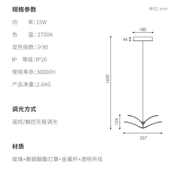 如翼吊灯用双层弯曲的造型作为主要造型特征形成在空间里自由灵动的造型,,,以一定的角度倾斜,,,,形成丰富的画面,,,,两翼的线条均为精心设计,,,,精准控制光线的传播,,,将直下光和漫反射光结合,,,,70%灯光向下,,,,30%灯光向上,,在空间里形成舒适的光学效果,,下灯罩为片状玻璃印刷专门调制的乳白色油墨,,,热弯成对应弧度,,,灯光透过灯罩呈现出更加柔和的视觉效果;边缘特意留有5mm宽度透明环,,,,使视觉更精致轻巧;灯罩利用两个金属“领夹”式的杆连接固定,,,整体视觉优雅;